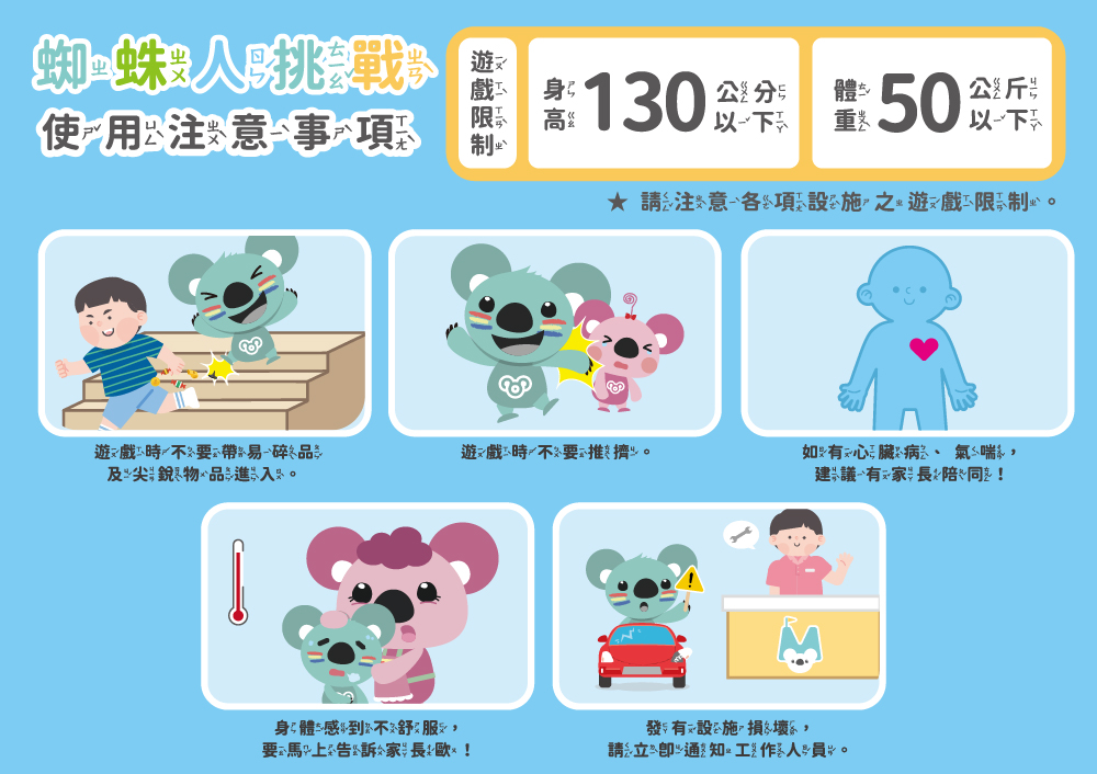 本設施遊玩限制:身高130公分以下,體重50公斤以下孩童使用。