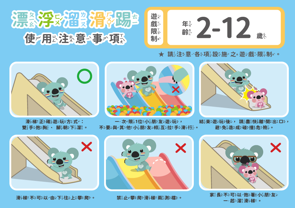 滑梯每次僅限1位孩童使用,請勿多人手拉手一起滑行。