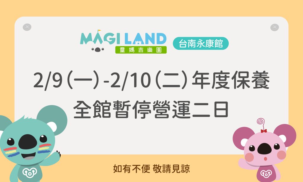 為了孩童的遊玩安全,童媽吉樂園將進行年度大清消。屆時全館將全面暫停開放兩日,如造成不便,還請見諒。實施館別:童媽吉樂園 台中永豐棧,清消日期:2/10(二)-2/11(三),實施空間:全館實施。